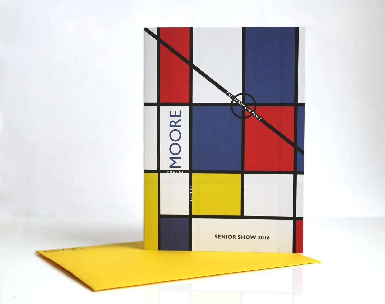 This identity for the 2016 Moore College of Art & Design’s Senior Show was inspired by the map of Philadelphia’s Logan Circle and the work of Piet Mondrian.